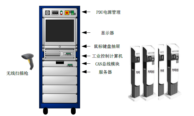 (3)設備組成:線束吊裝係統,測試結果聲光報警係統,電源管理模塊、顯示器、工控機、打印機、無線掃描槍、測試線束等。